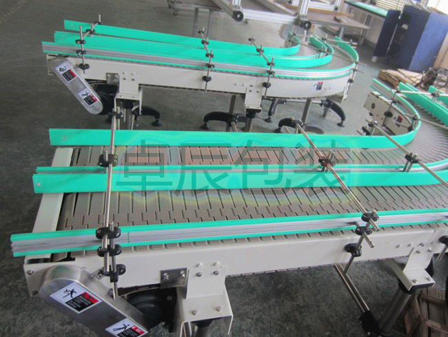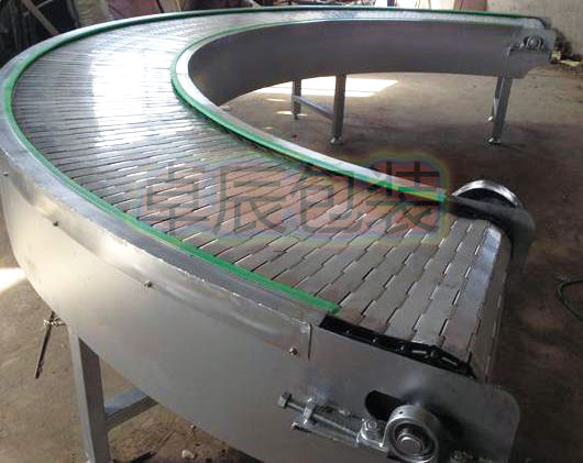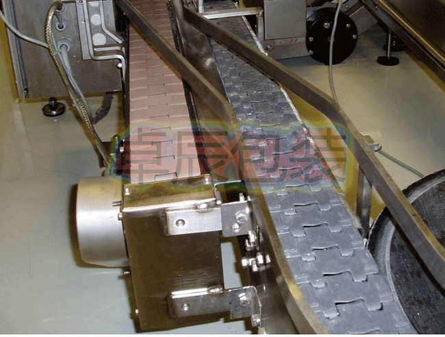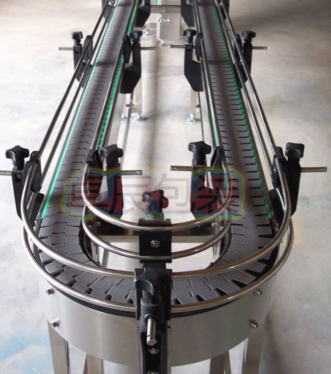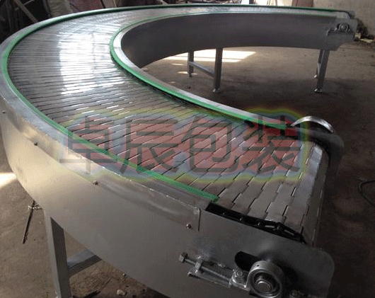 鏈?zhǔn)捷斔蜋C(jī)是在機(jī)器的兩側(cè)鏈條間加裝板式構(gòu)件,以達(dá)到輸送型態(tài)不規(guī)則的物品,在鏈板上加裝專用工夾具,并根據(jù)工控要求可作為裝配線,或直接采用塑鋼平頂鏈或不銹鋼平頂鏈作為輸送載體。使用轉(zhuǎn)彎鏈板即可 使用90度轉(zhuǎn)彎。
